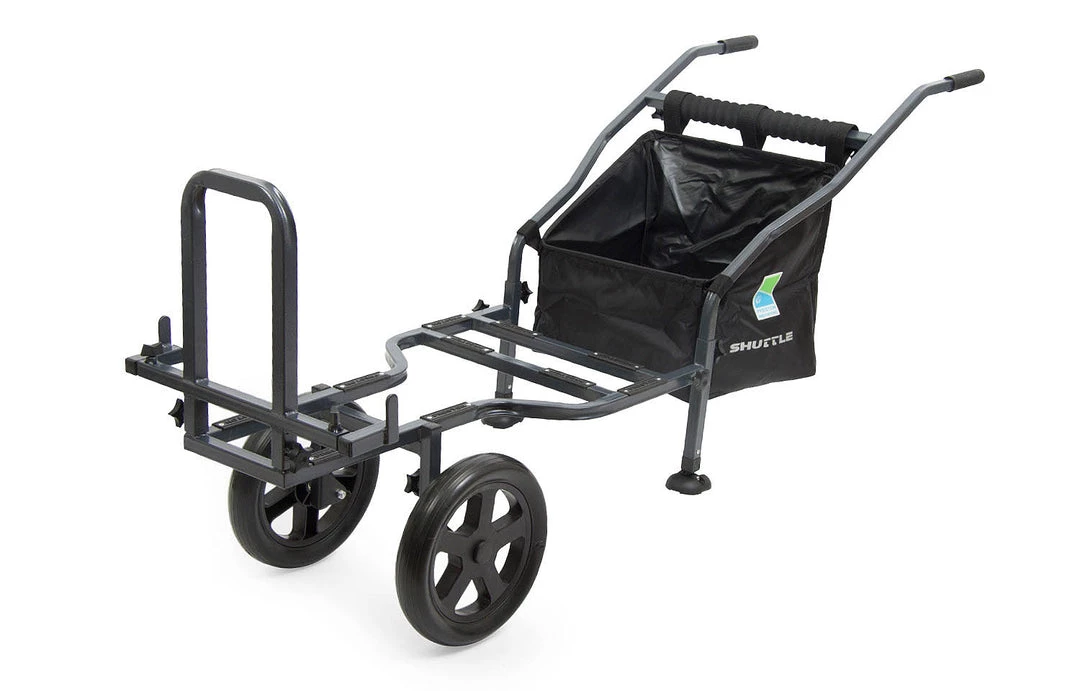 The Space Shuttle is a specially designed barrow style tackle transporter, that has been developed to carry the Space Station, XBox and other seatboxes using the additional converter bar (supplied). The design also provides a large luggage loading area for carryalls and an additional removable Utility Bag between the handles for clothing, pole rollers etc. In addition the Shuttle handle bar system incorporates a foam covered cross bar that can be used to support rod holdalls. Once the Shuttle is loaded, its design enables the angler to transport a complete set of tackle with ease compared to traditional seat box trolleys.