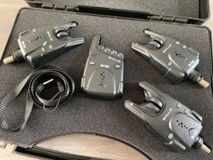 SKILLS Re-Con wireless bite alarm set. 3 alarms and a receiver set in presentation case. These classy alarms come with adjustable volume and tone controls and offer 3 different colours (red,white,green) to identify which rod has been triggered. Over 100 yards range on the receiver means you will never be too far away to hear that all important screamer ! You also have the option of adding a 4th alarm to the set ( sold seperately ).